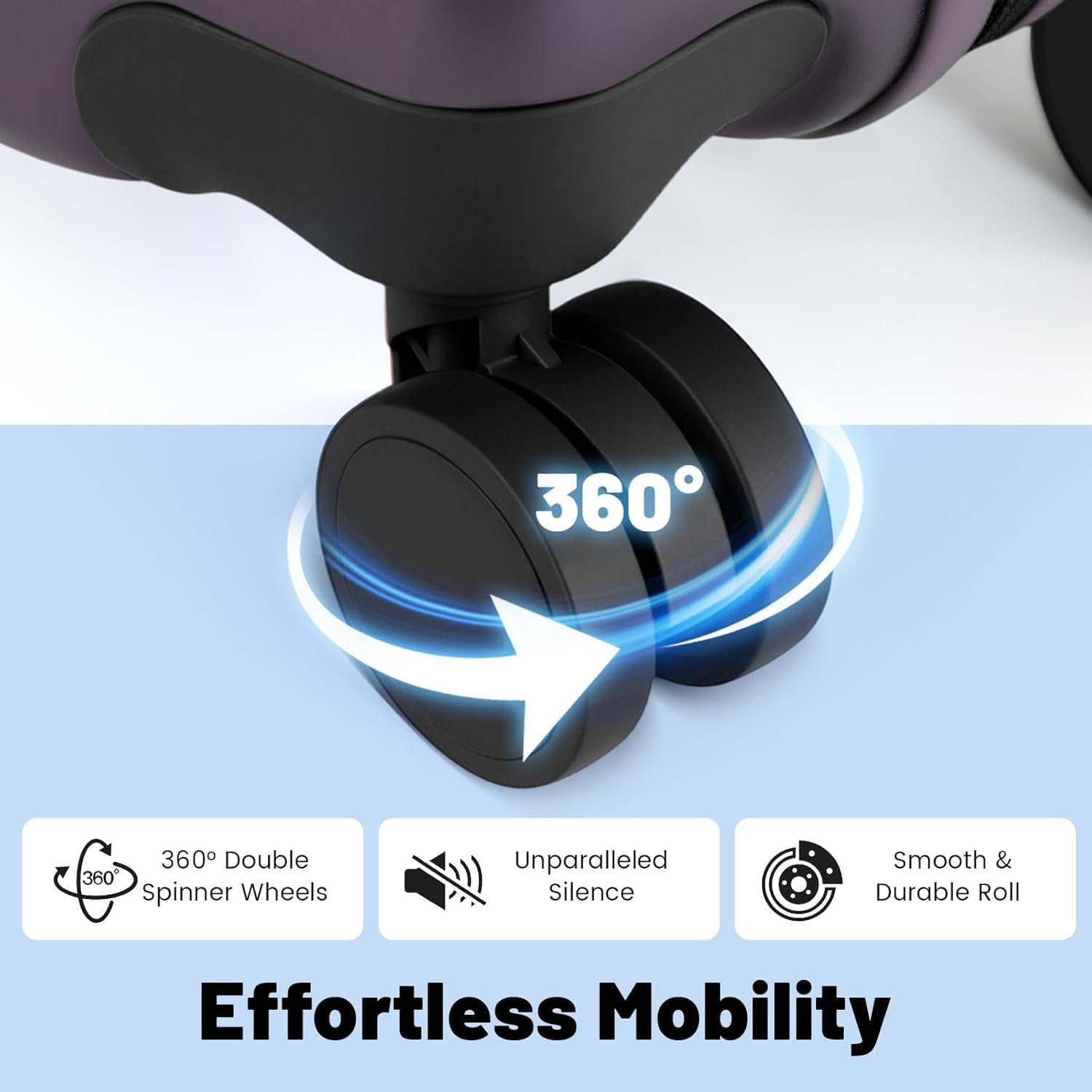 - Silent 360° Spinner Wheels: Precision-engineered multi-directional wheels glide smoothly over any surface—concrete, carpet, or tile—with minimal noise. The sealed bearings reduce friction and prevent debris buildup for consistent performance in diverse environments.