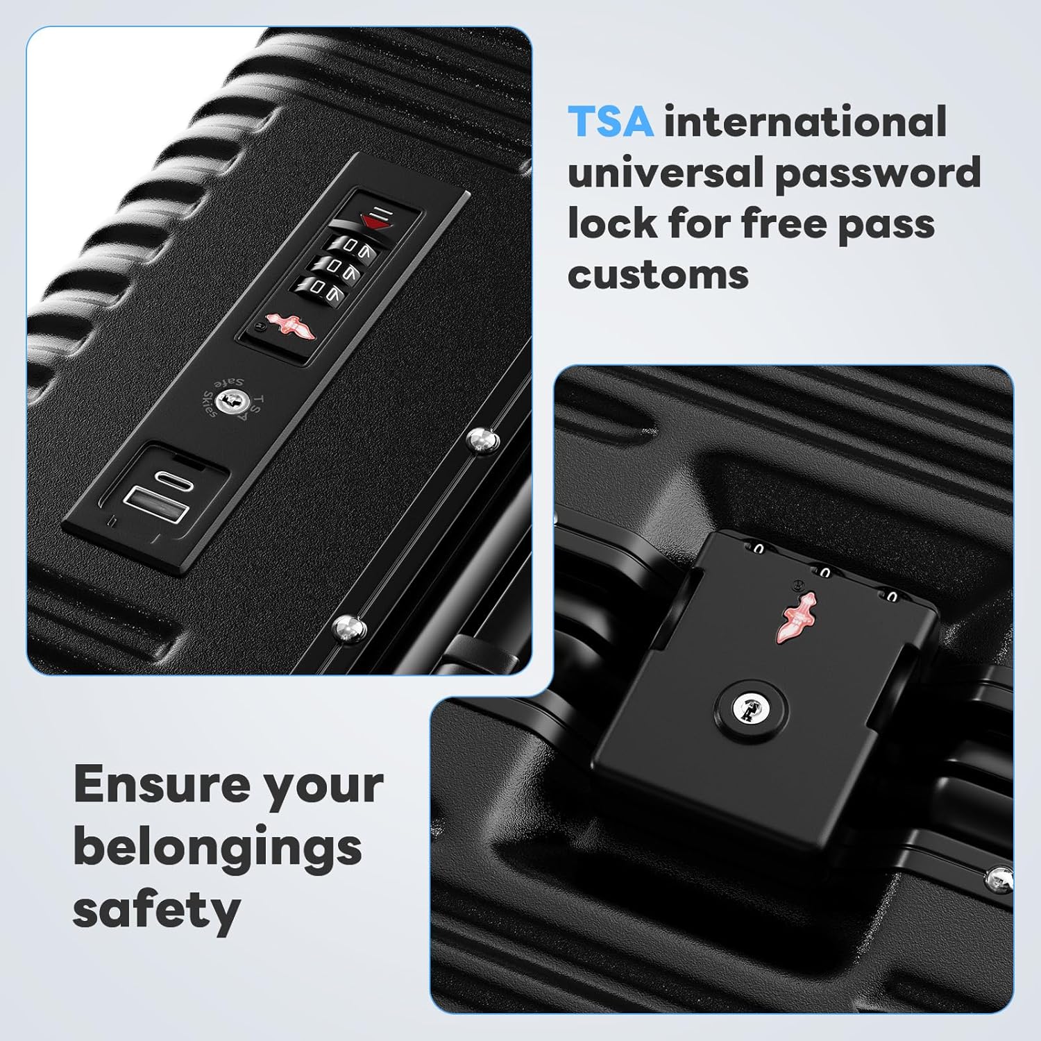 - Package includes: 1 × Luggage, 1 × TSA lock, 1 × USB charging cable adapter.