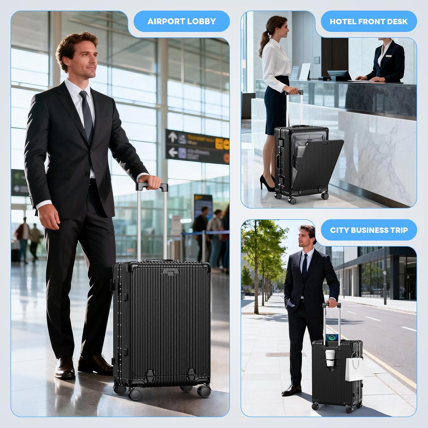 This suitcase excels for professionals needing quick device access during travel, digital nomads requiring onboard charging, and travelers prioritizing stress-free airport transitions. The front pocket eliminates fumbling through packed bags to find tech gear before security checks—perfect for last-minute document retrieval or recharging phones mid-transit.