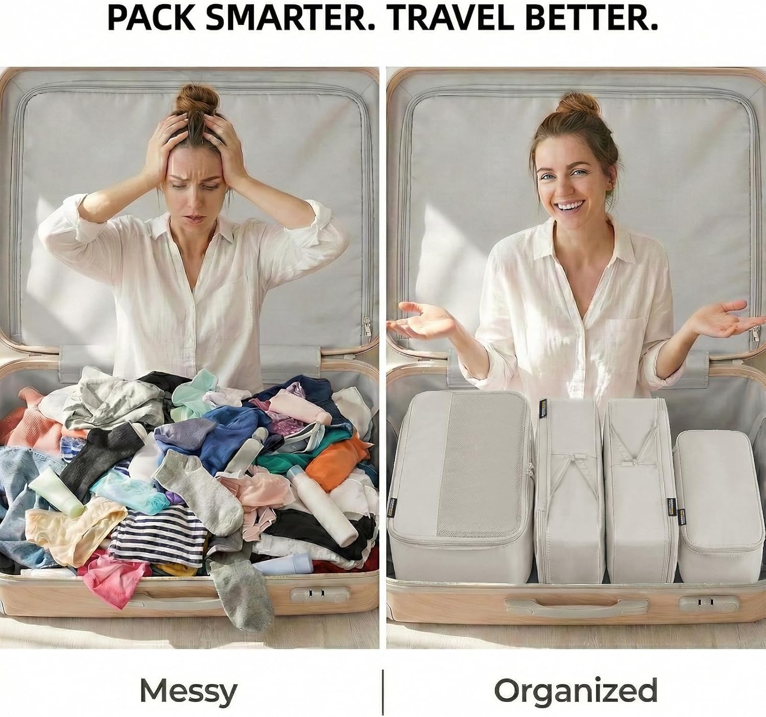 Care should be taken when zipping and unzipping to avoid overstuffing the cubes, as this may strain the double-zipper mechanism over time. For best results, fold clothing neatly before placing it inside. The cubes are intended for short-term travel only and may not provide sufficient compression for longer trips where bulk reduction is critical. Always verify final dimensions against your luggage’s interior capacity before packing.