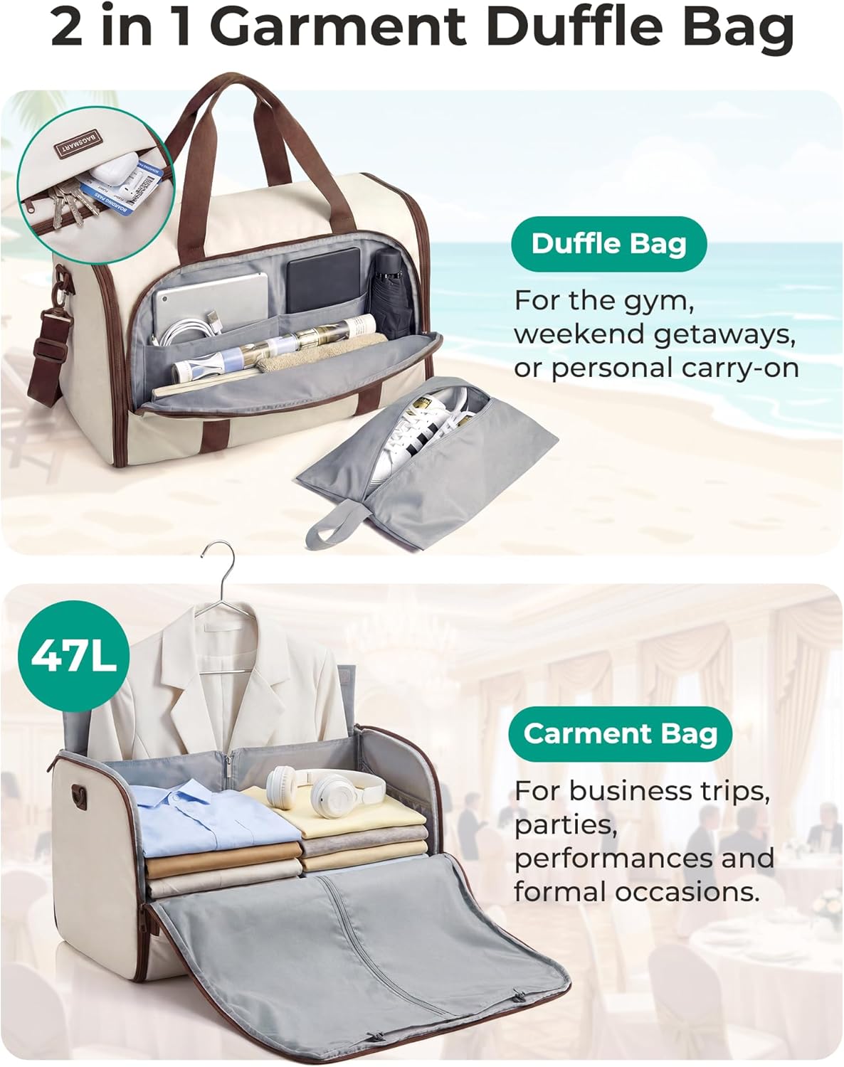 This versatile 2-in-1 garment bag duffle is designed for travelers who value both functionality and organization. Whether you’re packing for a business trip, weekend getaway, or formal event, this bag adapts to your needs by transforming from a spacious carry-on duffle into a hanging garment protector. Its thoughtful design includes dedicated compartments for suits, dresses, shirts, shoes, and accessories, making it ideal for anyone who wants to keep clothes wrinkle-free and neatly stored.