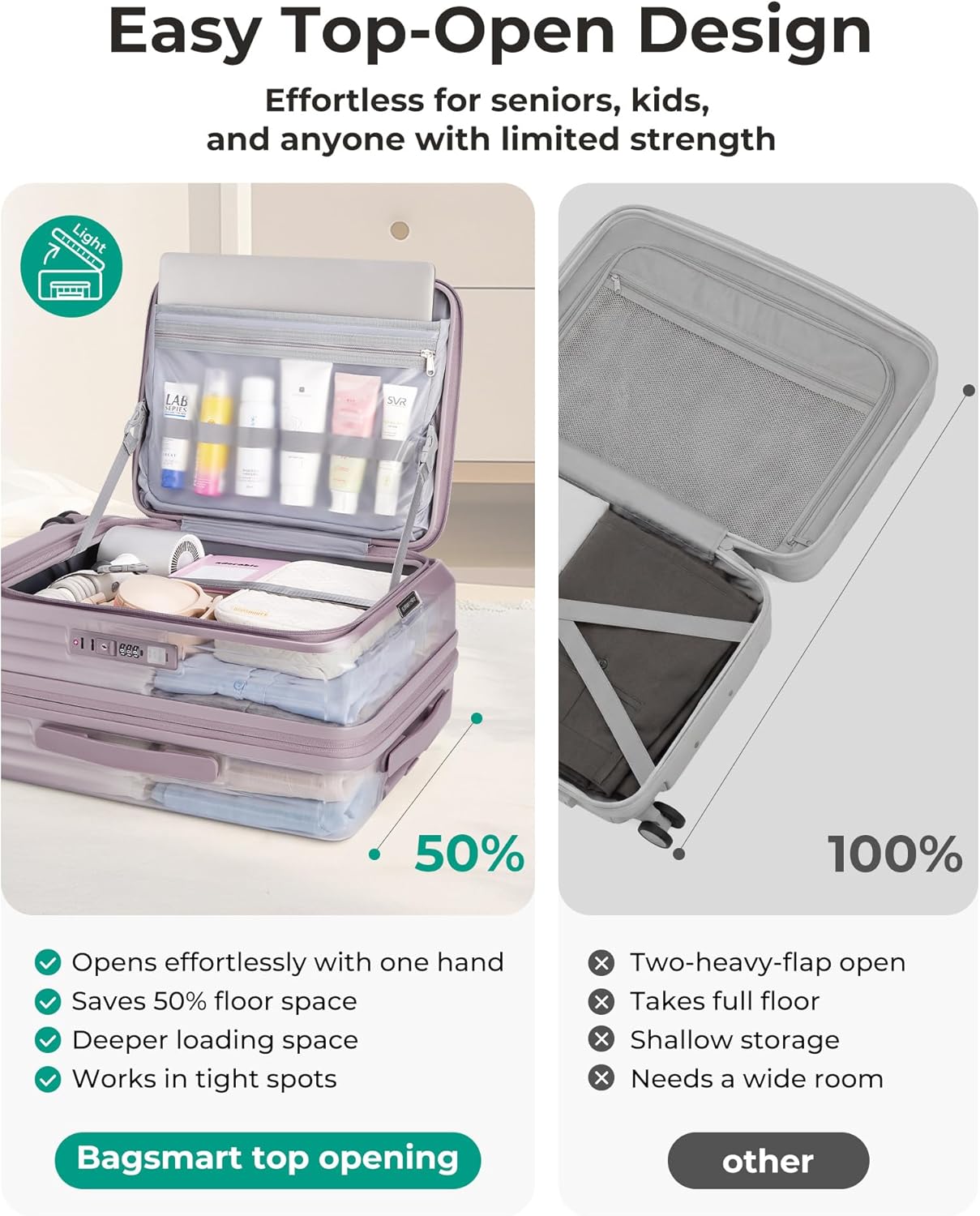 The BAGSMART Top Opening Carry On Luggage redefines what a carry-on can be—offering travelers a smarter, more spacious solution that fits within airline size restrictions while delivering the roominess of a larger suitcase. Designed with the modern traveler in mind, this 22x14x9-inch hard-shell suitcase combines innovative deep-compartment engineering with practical organization features. Unlike traditional side-zip carry-ons, its top-opening lid allows effortless access to your belongings without disturbing stacked items, making airport retrieval faster and more efficient. Whether you’re heading on a business trip, a weekend getaway, or daily commuting, this suitcase ensures your essentials stay secure, organized, and easily accessible throughout your journey.
