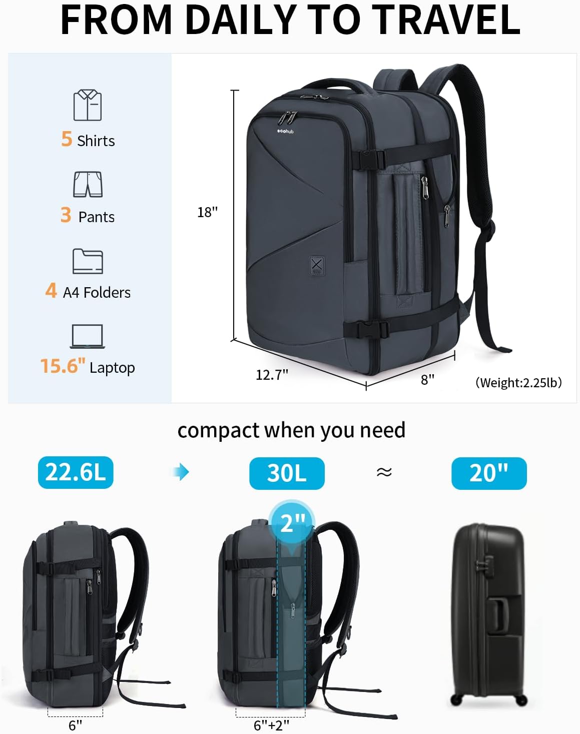 【22.6L/30L, From Each day to Journey】This expandable journey backpack adjusts from 18″ x 12.7″ x 6″ (22.6L) to 18″ x 12.7″ x 8″ (30L), offering versatile storage on your necessities—ultimate for 2-4 day journeys and day by day work. It meets carry-on measurement necessities for main U.S. airways like American, Delta, United, and Alaska, letting you journey WITHOUT BAGGAGE FEES. With high-quality SBS zippers, get pleasure from easy entry and long-lasting sturdiness. (PATENT PENDING)