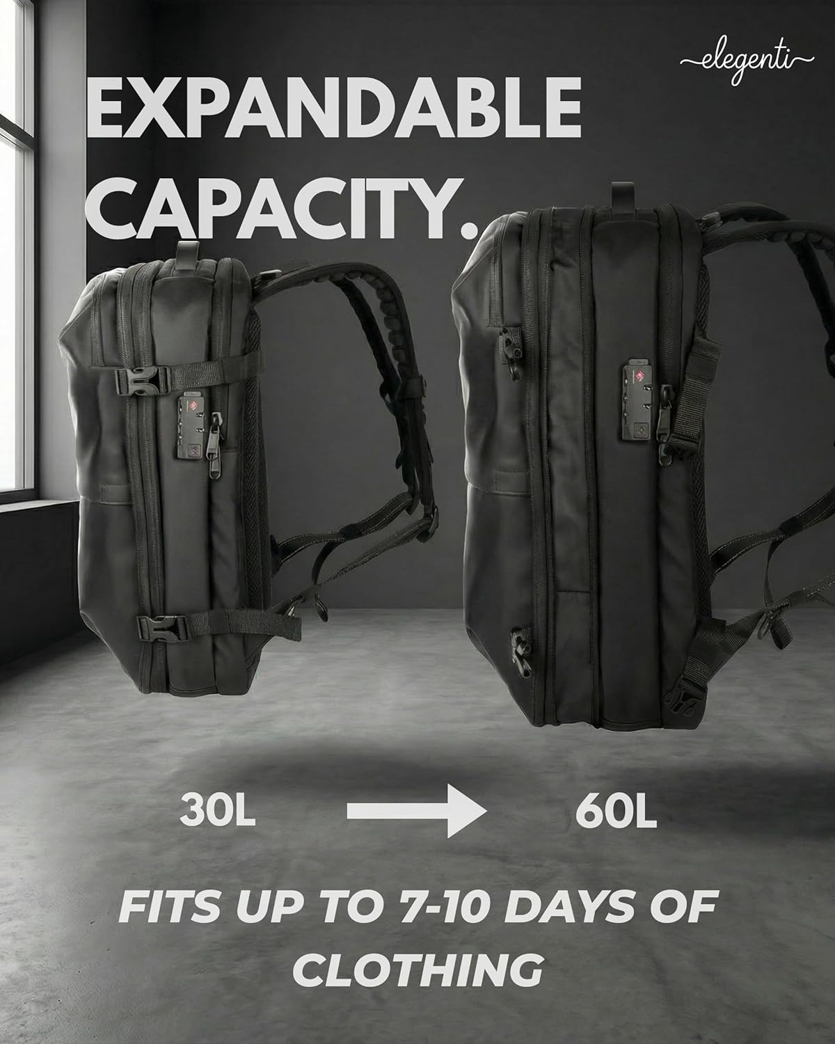 - Expandable 60L Design: The backpack features an expandable structure that increases storage from its standard capacity to 60 liters when needed. This flexibility supports both compact travel and occasional need for extra space without switching bags.