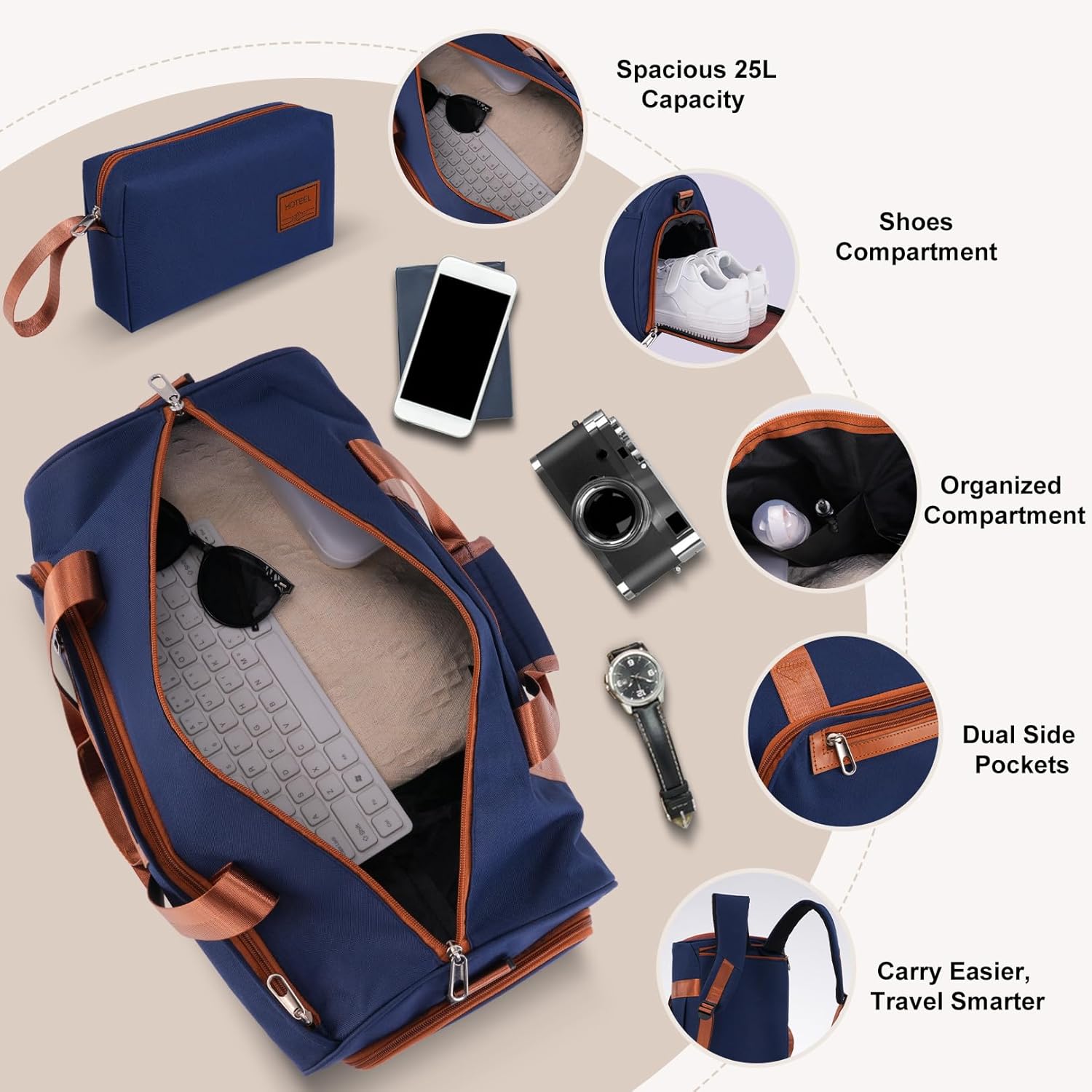 • Convertible 25L Duffel Bag: Features a dedicated shoe compartment, multiple pockets, and adjustable straps that can be worn over the shoulder or carried by hand, offering versatile storage options.