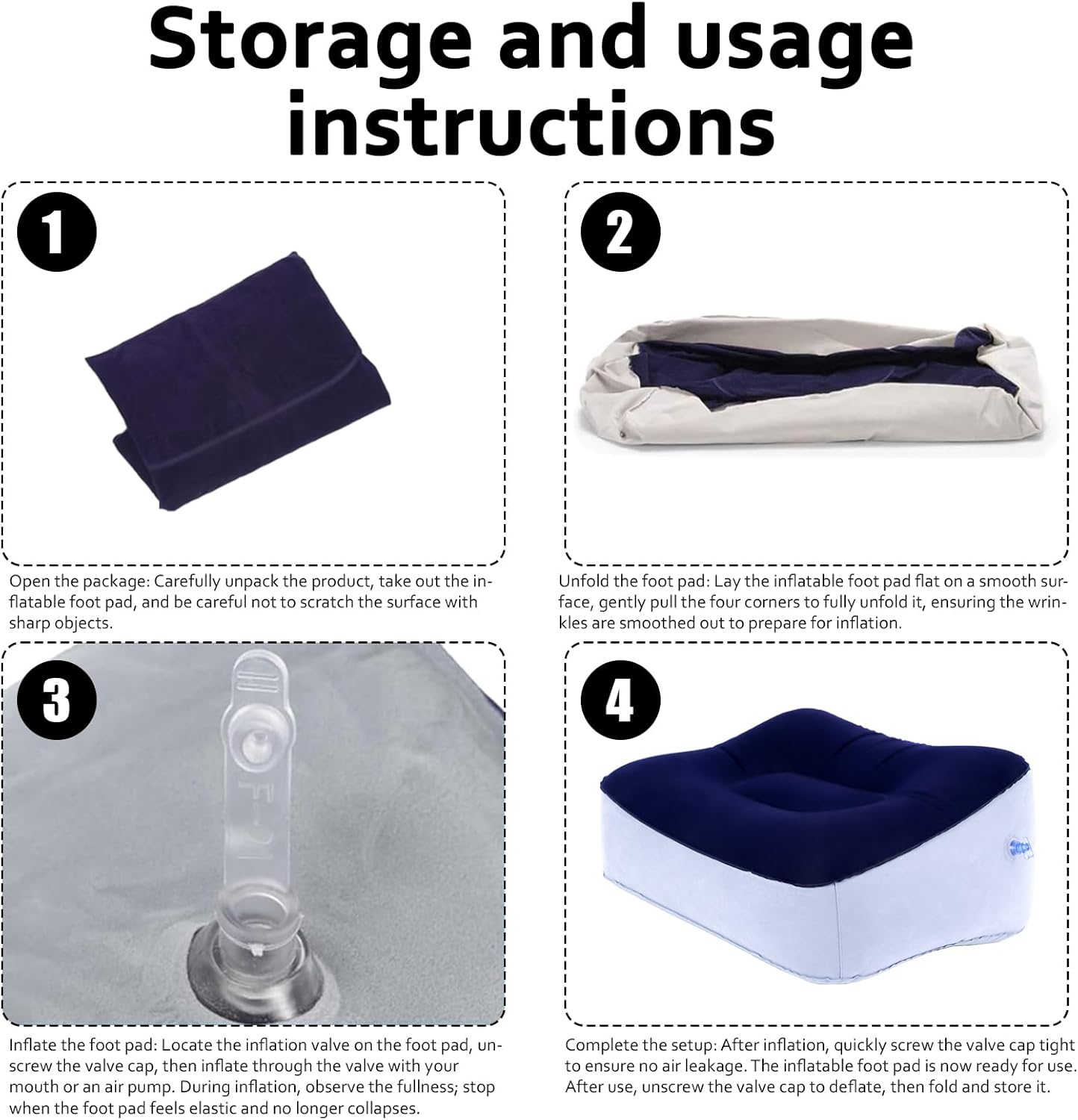The Inflatable Foot Rest Pillow is a portable, lightweight travel accessory designed to elevate feet and legs during long flights or extended sitting periods. Ideal for economy class passengers, frequent flyers, and travelers seeking added comfort on the go, this inflatable foot rest enhances circulation and reduces leg fatigue. Its compact design makes it easy to carry in a carry-on bag, while the quick inflation valve allows full setup in just 4–5 breaths. The upgrade version offers improved durability and user experience, making it a practical addition to any travel kit.