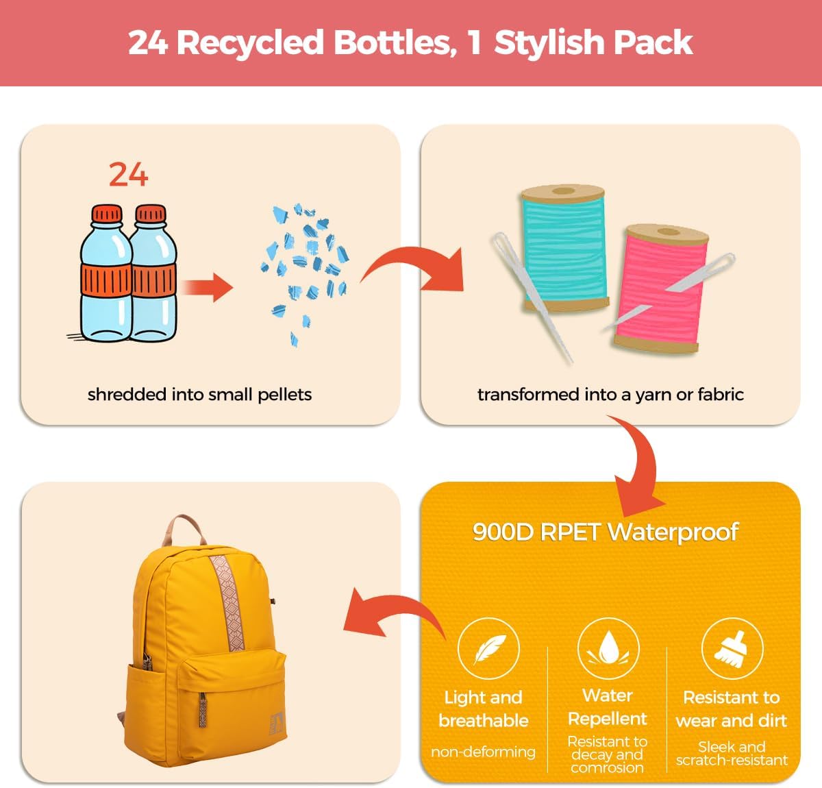 - Material: 900D RPET (Recycled Polyester), equivalent to 24 post-consumer plastic bottles