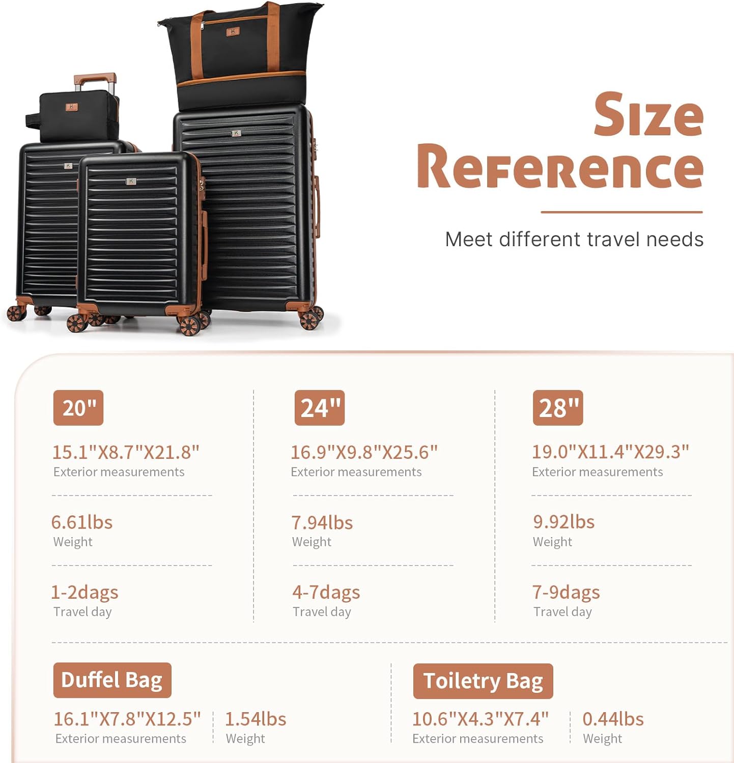 - Luggage Set Size: 5 pieces (28″ + 24″ + 20″ + backpack)