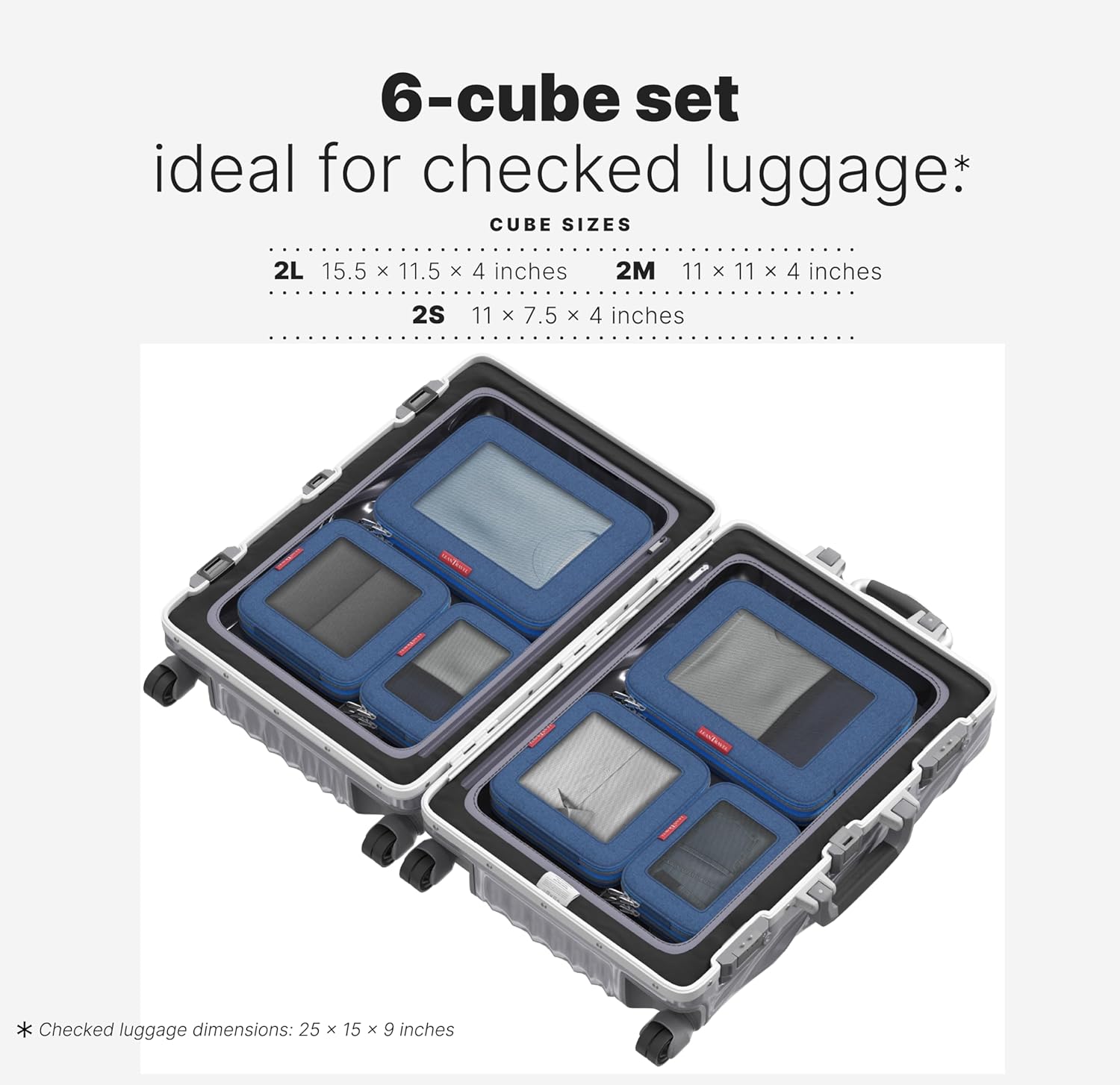 - 6-Pack Set in Navy Blue: Includes six identically sized cubes in a sleek, versatile navy shade that pairs well with nearly any travel gear or luggage color. This cohesive set gives you the flexibility to sort different types of clothing—tops, bottoms, underwear, swimwear, accessories—making it easier than ever to find what you need quickly at your destination.