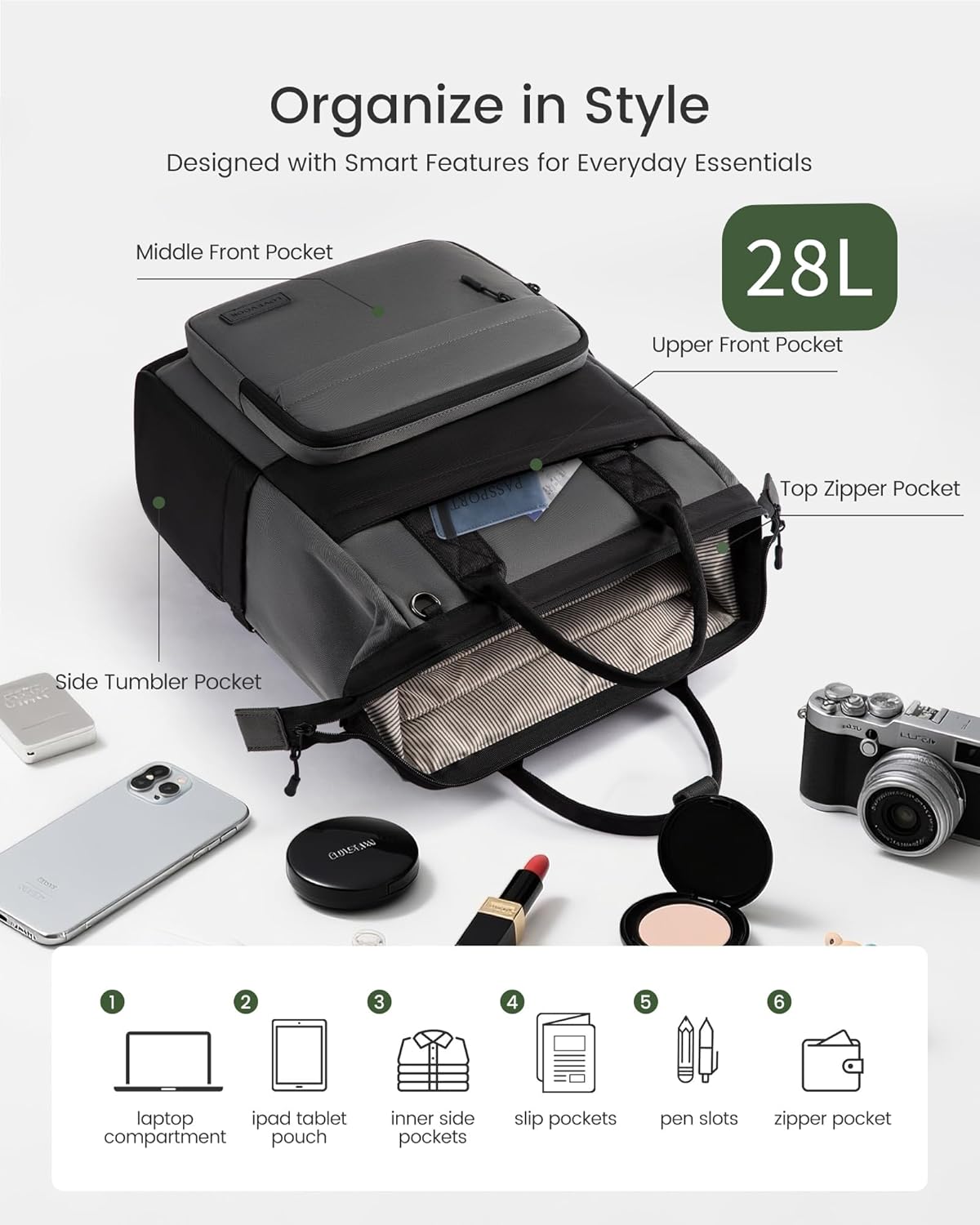 【Journey-Prepared Options】A baggage strap secures this journey backpack for ladies to your keep on lugagge. Stretch aspect pockets with built-in cup holders hold bottles in place — excellent for commutes, flights, or lengthy campus days.