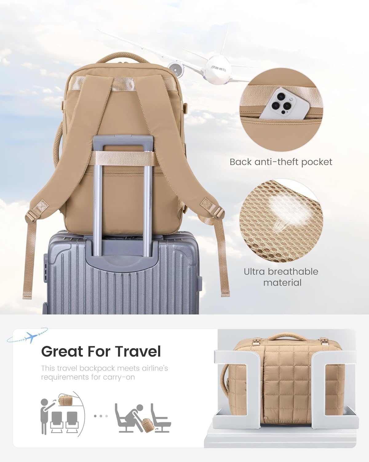 【Moveable Boarding】The 180 diploma zipper closure permits for fast mendacity down and trying to find objects, and is appropriate for putting on prime of the top and below the seat. The keep on backpack for airplane journey additionally meets the keep on necessities of airways. The highest and sides of the keep on bag are outfitted with two padded handles, offering a number of methods of carrying and will also be secured to the baggage deal with for straightforward boarding