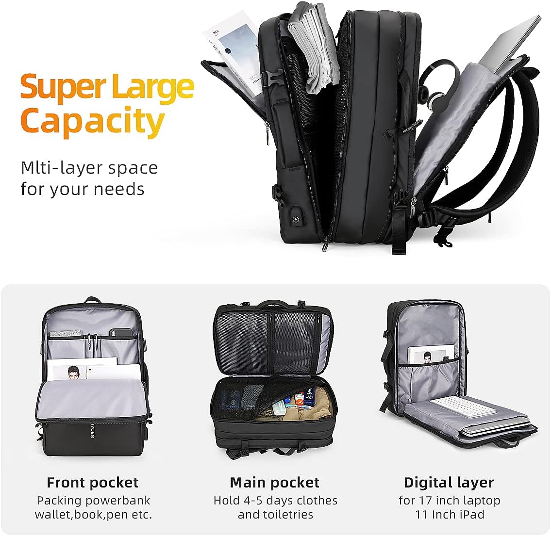MARK RYDEN Travel Backpack for Men, 40L Carry On Backpack, Water Resistant 17.3 Inch Laptop Backpack with USB Charging Port for Business Work College Weekender Travel-Black