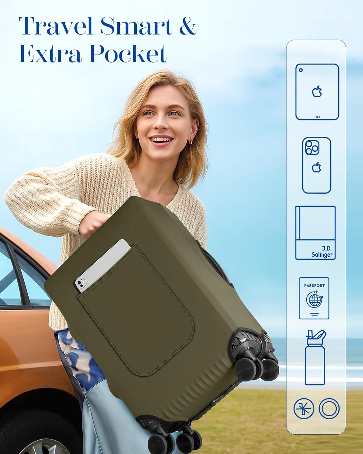 - Convenient Front Pocket: Includes an extra zippered pocket on the front for storing small essentials like passports, boarding passes, travel adapters, chargers, or snacks. This allows quick access to important items without removing the entire cover.