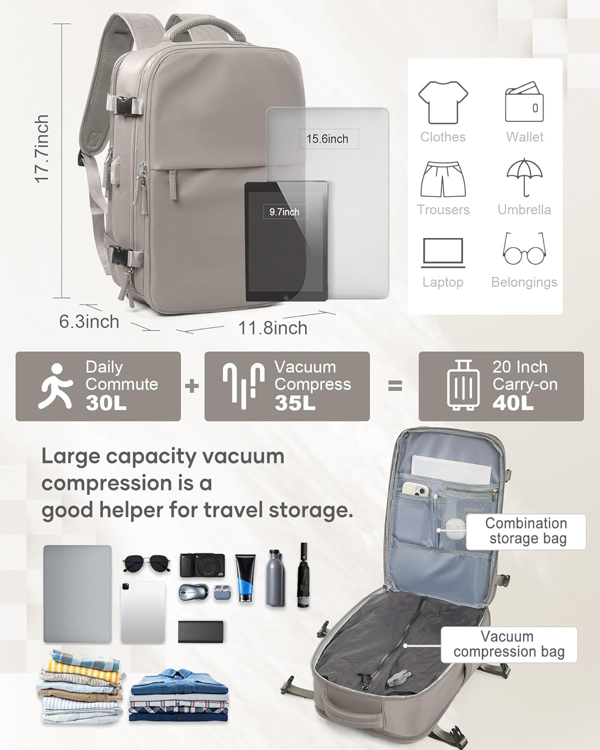 The product package includes exactly one travel backpack, one vacuum storage bag, and one electric vacuum pump—no additional accessories are provided beyond these items. Users should ensure compatibility of their laptop size (up to 15.6 inches) before purchase. While the backpack is constructed for durability, proper care during washing and storage will help preserve its functionality over time.