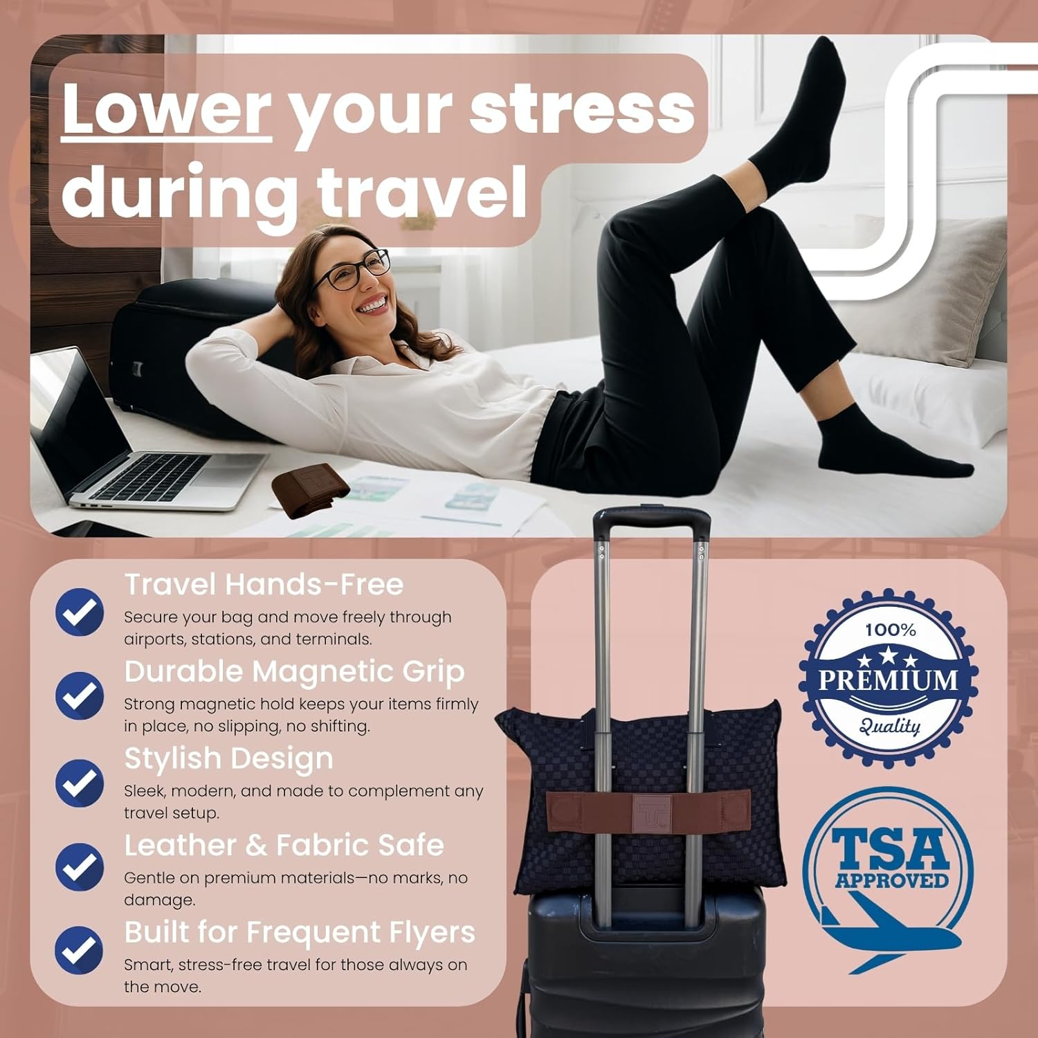 - Universal Compatibility: Works seamlessly with a wide range of personal bags including totes, backpacks, purses, crossbody bags, and small carry-on luggage. Whether you’re traveling with a leather handbag, canvas tote, or lightweight backpack, this strap adapts to fit your existing gear.