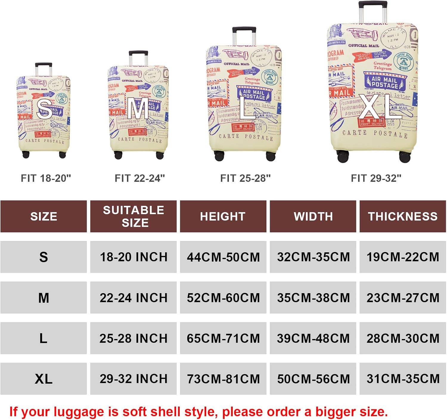 Please note that this product fits suitcases within the stated size ranges—specifically, the S size accommodates 18–24 inch dimensions, while the XL size is intended for 29–32 inch models. Always measure your suitcase diagonally from corner to corner to confirm compatibility before purchase. The cover should not be used on rolling backpacks or non-suitcase luggage types.